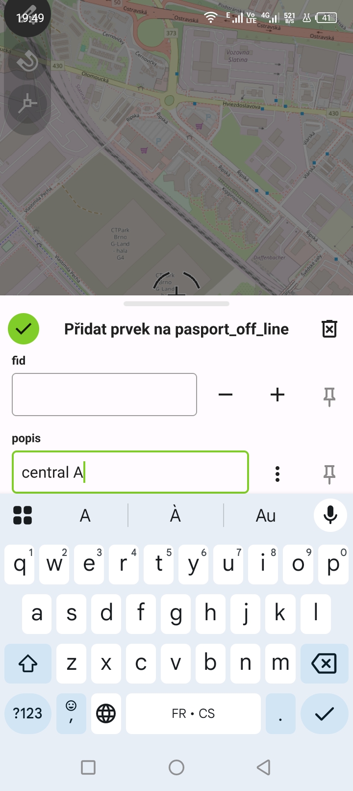 K formuláři je možné se tedy dostat stejně jako v případě editace a to dotykem (kliknutím) na prvek v mapě a následně výběrem prvku ze seznamu.