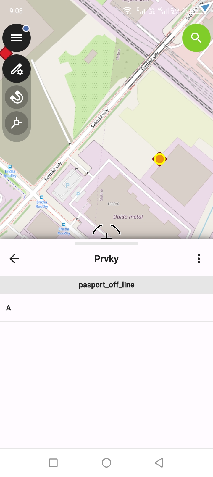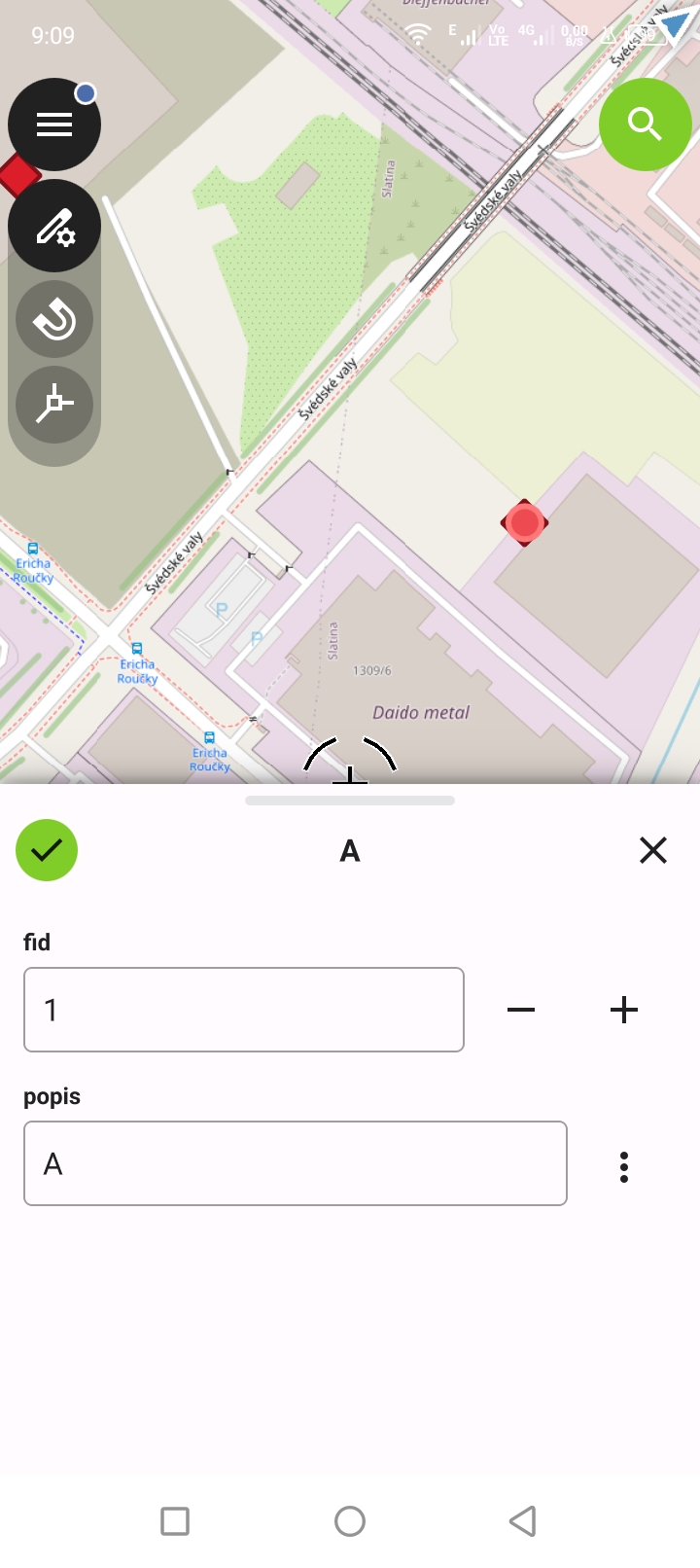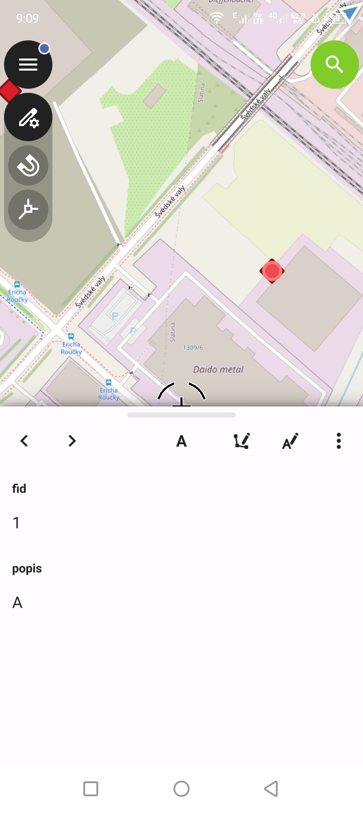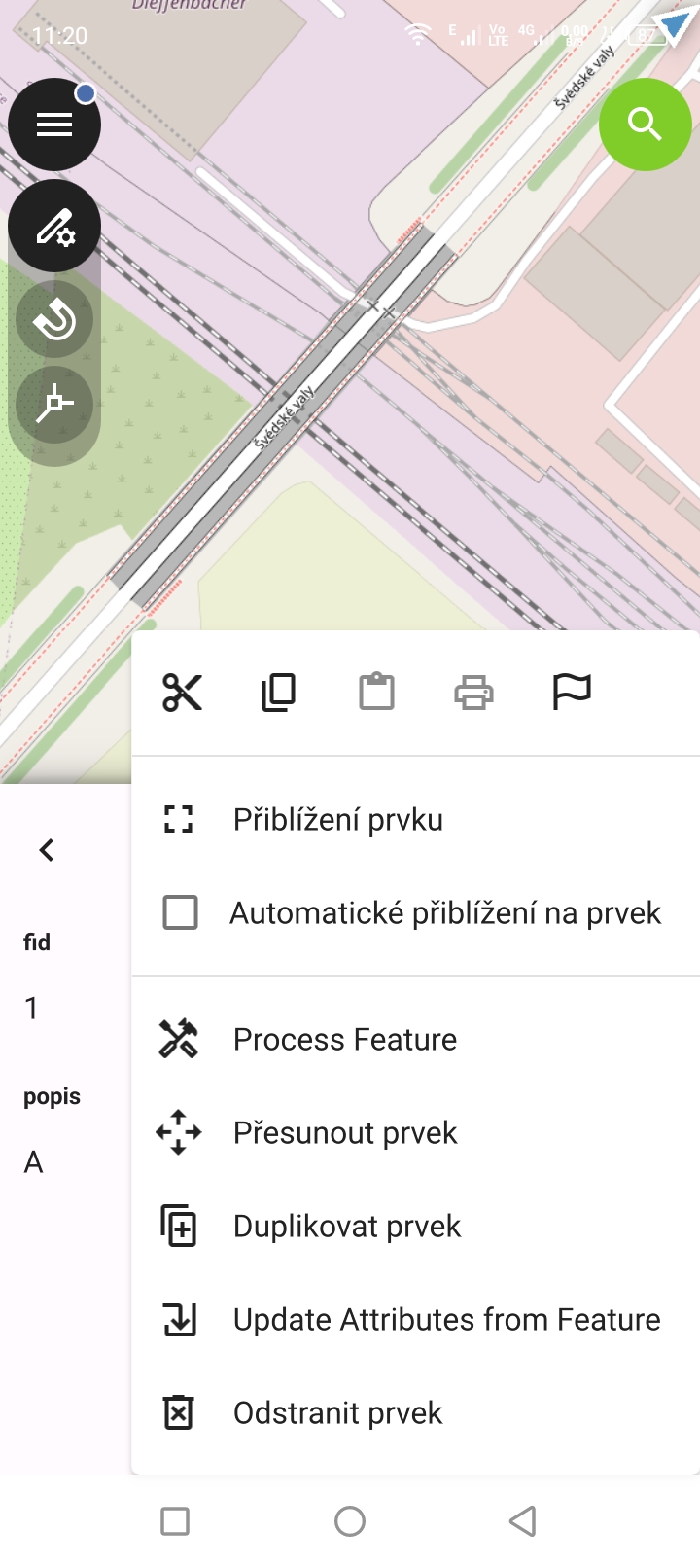 Klikneme (dotkneme se) geoprvku v seznamu (na obrázku text "A"), čímž aktivujeme další funkce.