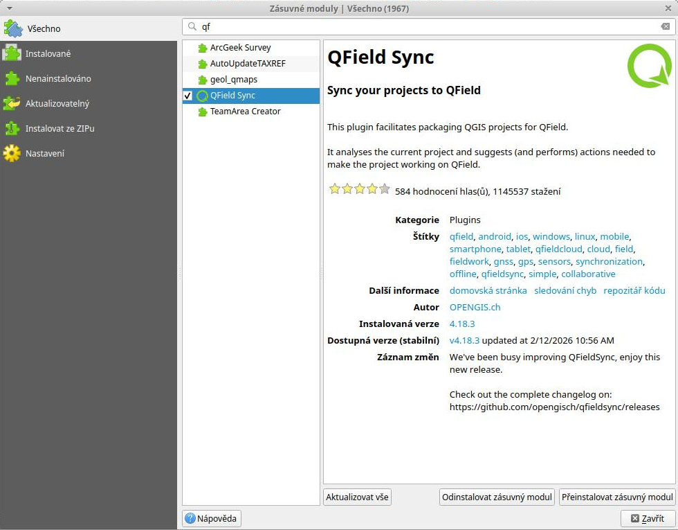 QFieldSync se instaluje stejně jako jiné moduly z hlavního repozitáře QGIS.