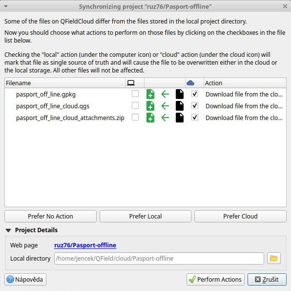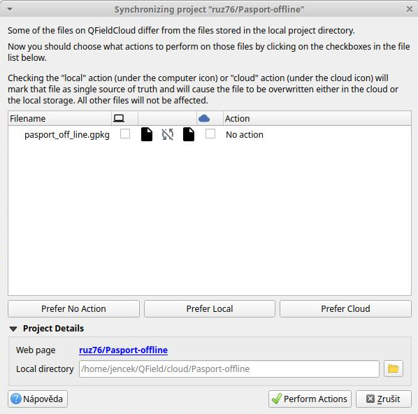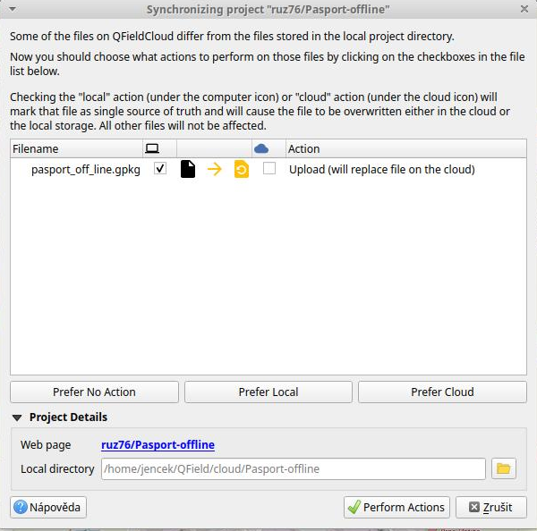 QFieldSync neumí data plně synchronizovat zpět na QFieldCloud. Komunikace QGIS (local) a QFieldCloud (cloud) nesynchronizuje, ale přepisuje, a vždy je třeba zvolit, které soubory preferujeme - local vs. cloud. QField a QFieldCloud, ale data plně synchronizuje, spojí .qpkg do jednoho, a verze jsou viditelné na webu QFieldCloud. Pokud je nutná úprava dat v QGIS jsou různá řešení pro různé případy (např. použití samostatné vrstvy nebo první synchronizovat projekt do QGIS a pak zpět za předpokladu že všechna data jsou již na cloudu)