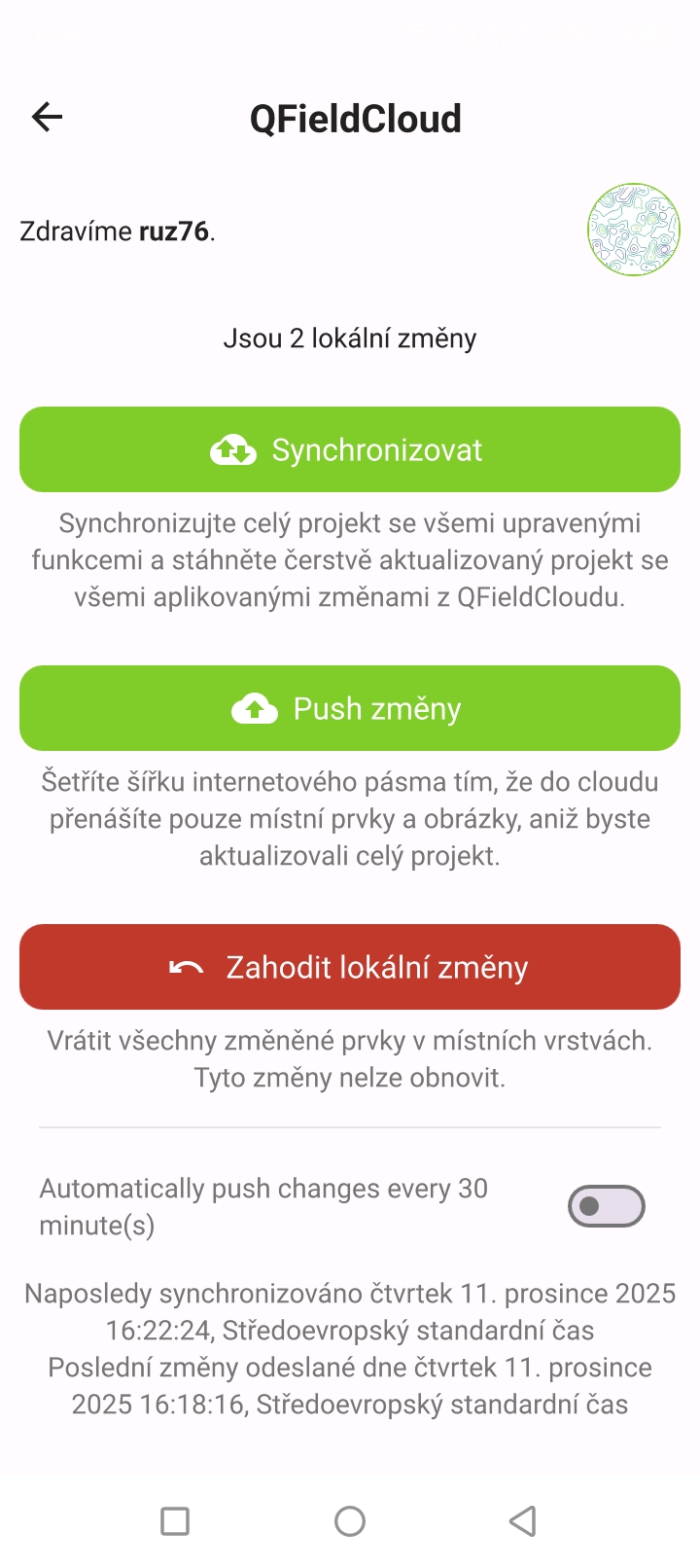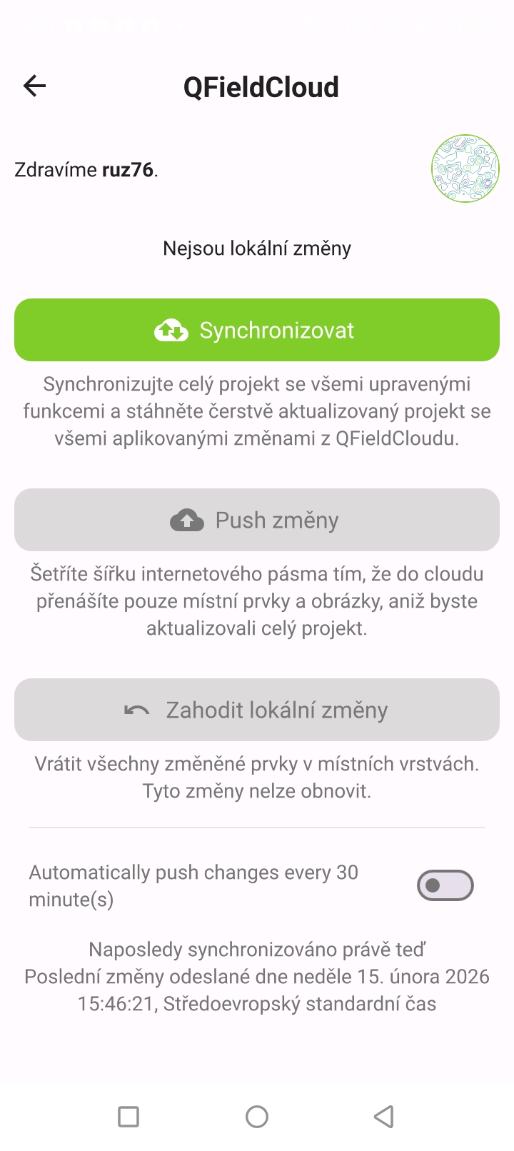 V případě, že jsme provedli nějaké změny na straně mobilní aplikace a máme projekt načten z QFieldCloudu je synchronizace snadná.