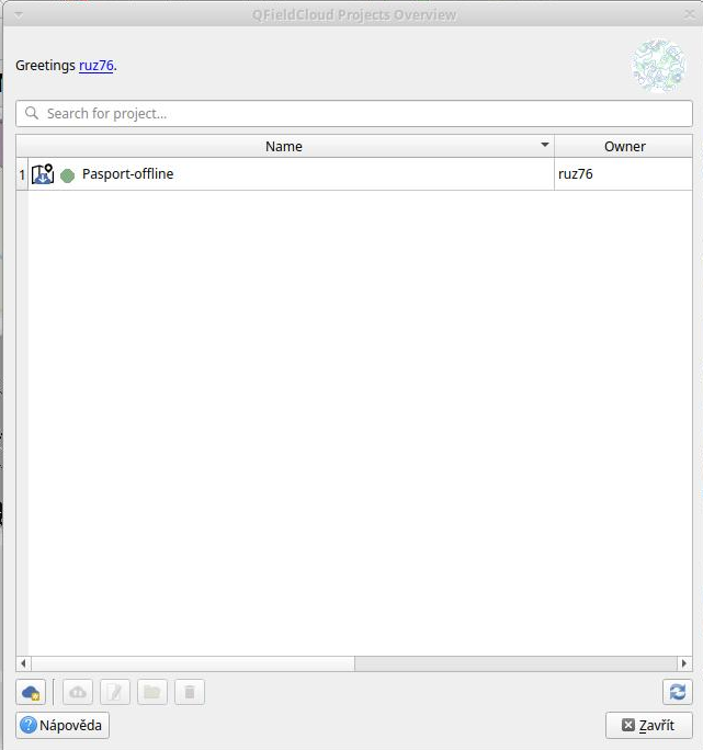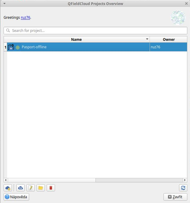 K načtení dat z QFieldCloudu slouží první dvě tlačítka na liště. První použijeme v případě, že zatím projekt na disku nemáme k dispozici. Druhé v případě, že již projekt máme k dispozici a je aktuálně otevřen v QGIS.