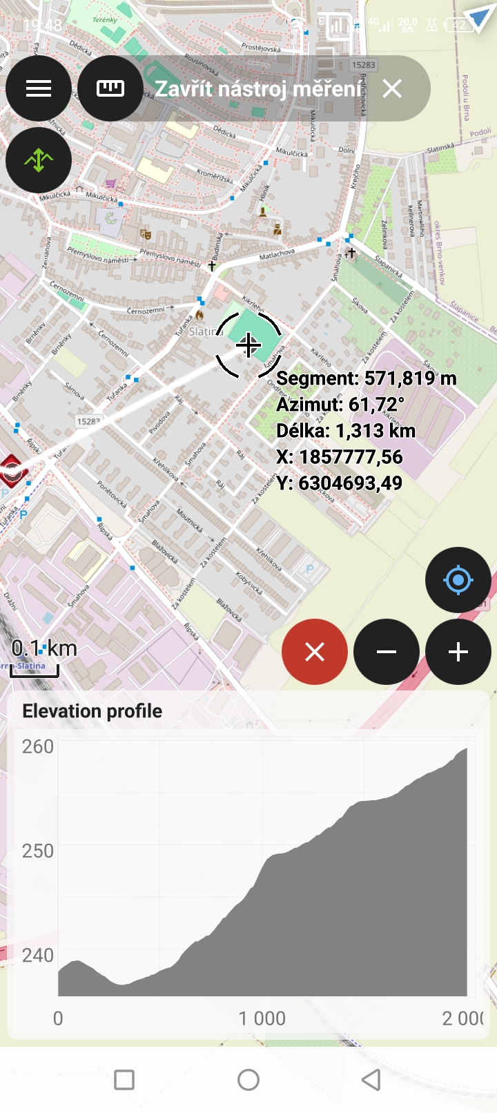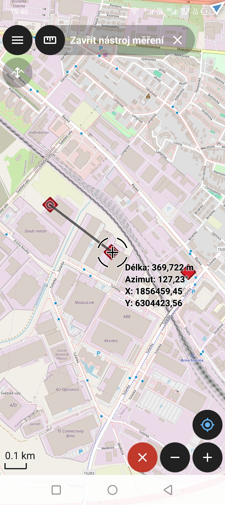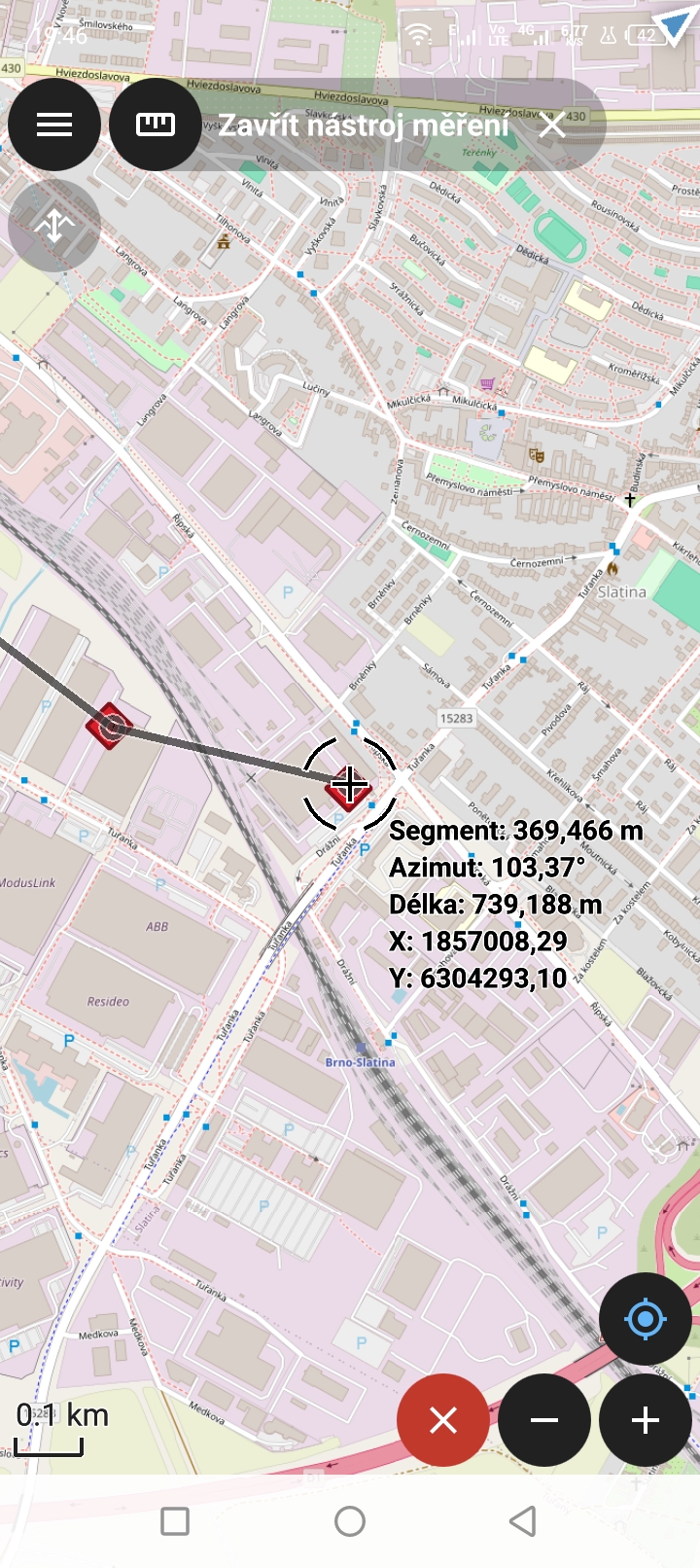 Následně zvolíme ikonu Plus pro přidání bodu. Pak posuneme mapu, tak aby druhý bod měření byl n amístě kurzoru. Interaktivně se nám zobrazuje délka segmentu a azimut linie vůči severu ve stupních.