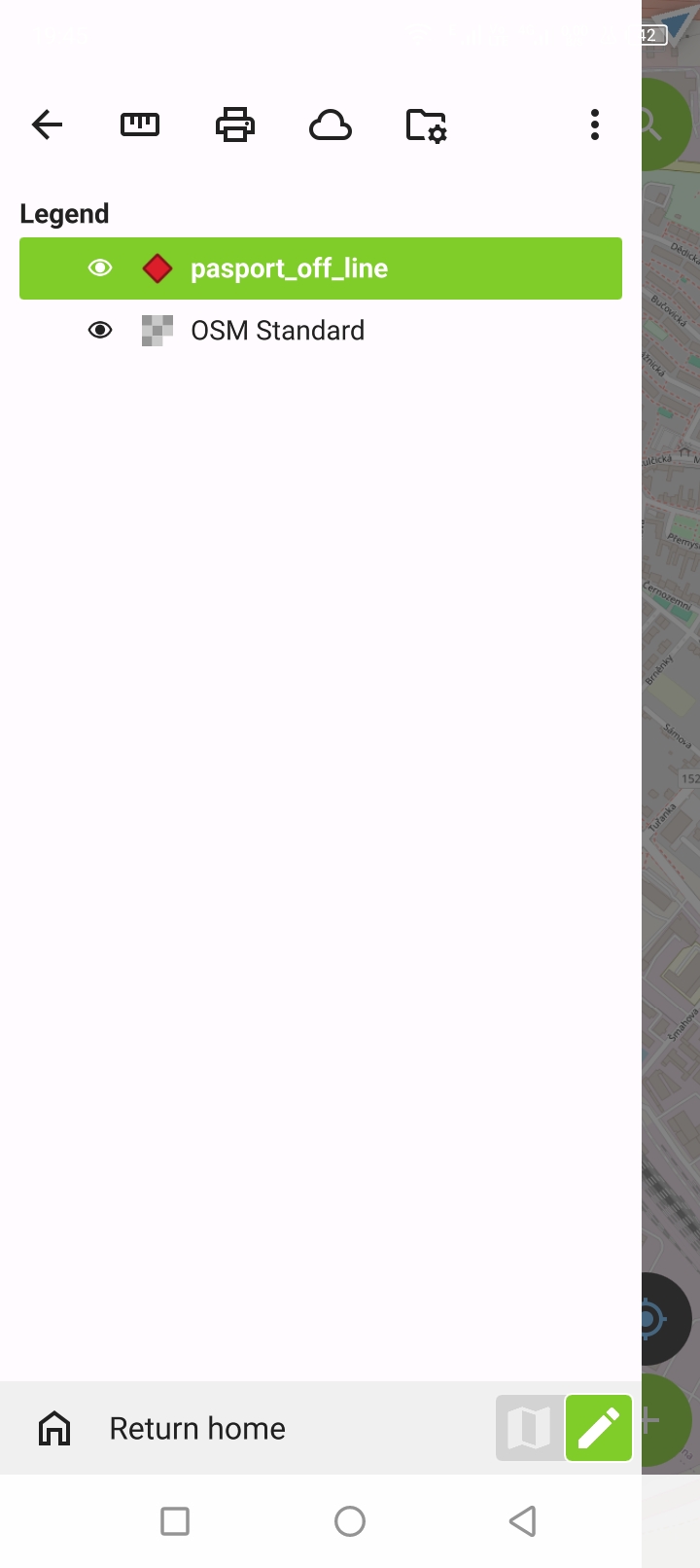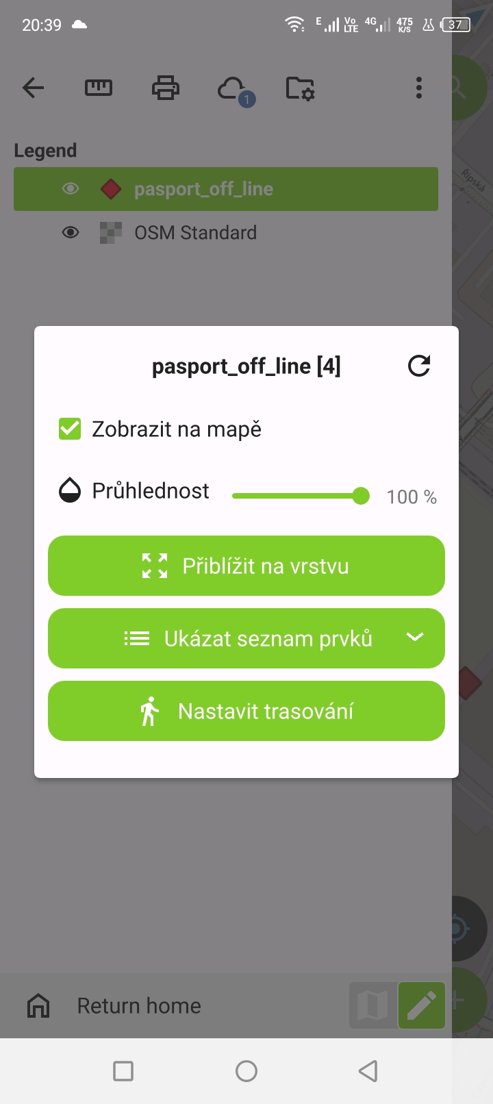 Podržením prstu na vrstvě aktivujeme informace o vrstvě, jako je průhlednost, počet prvků nebo možnost zobrazení seznamu prvků.