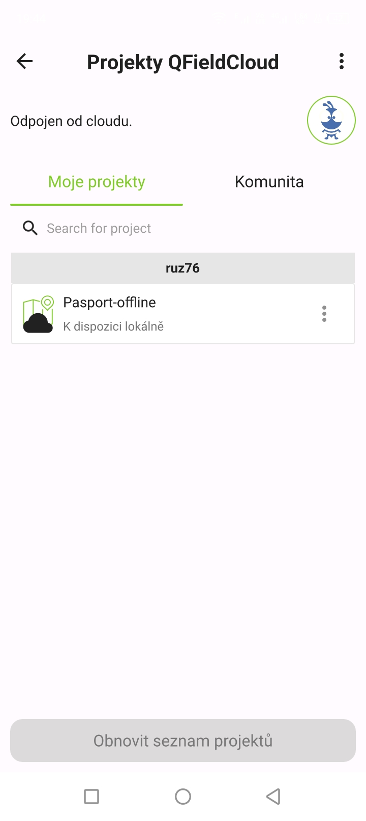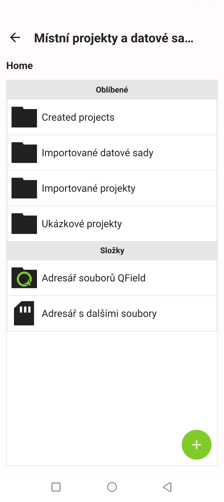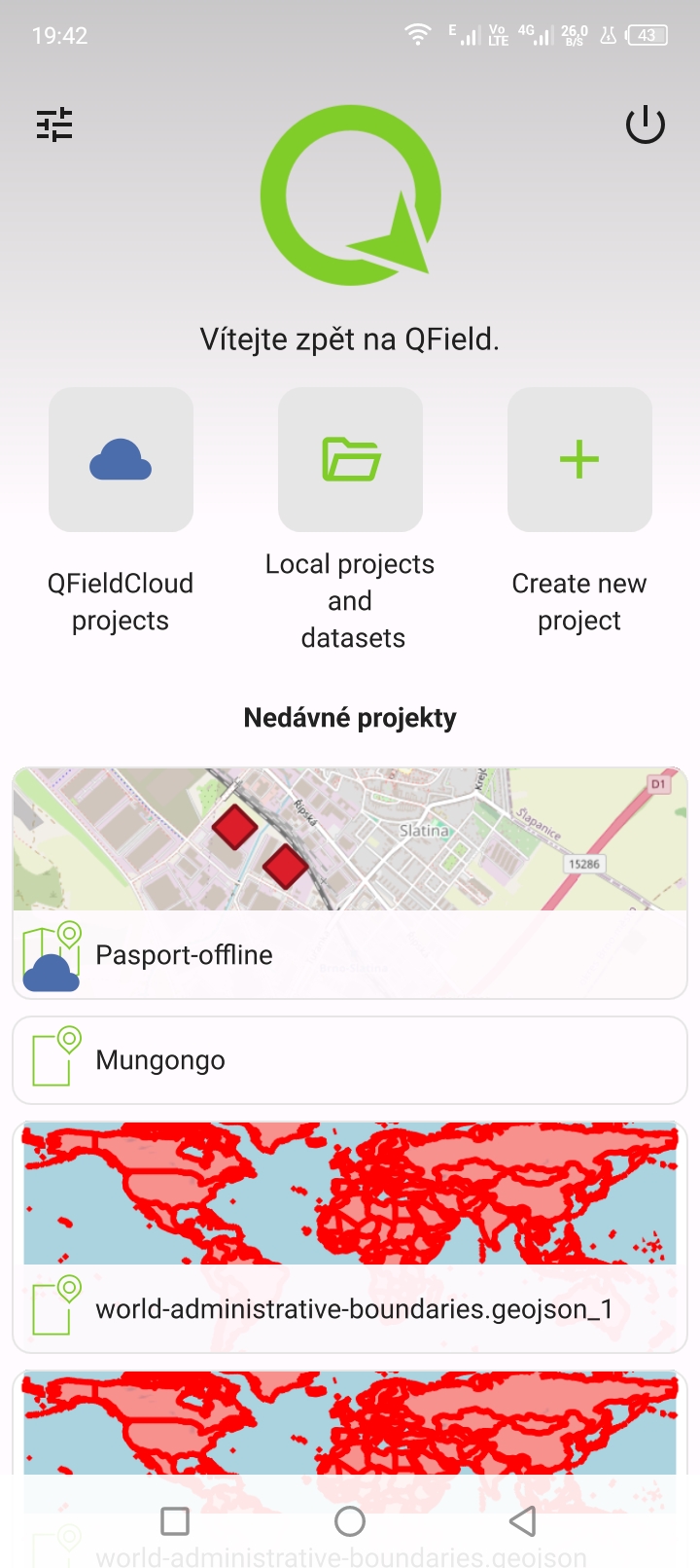 Po spuštění aplikace QField je možné zvolit otevření buď lokálních projektů nebo projektů z úložiště na cloudu (např. QFieldCloud). V rámci QField je možné rovněž vytvářet nové projekty.
