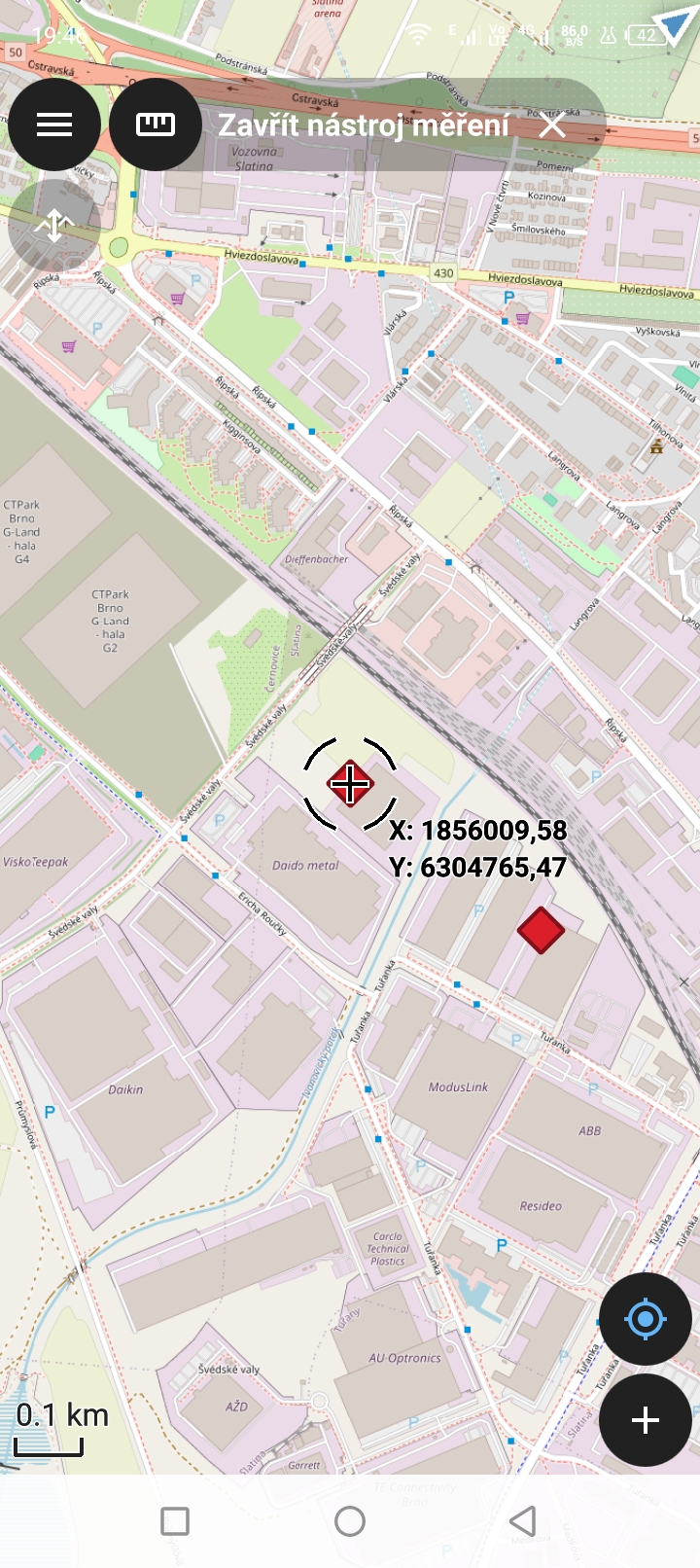 V rámci Panelu vrstev najdeme další funkce. Jednou z nich je měření vzdálenosti. Vzdálenost měříme postupným přidáváním bodů do polylinie. Přidávání bodů se realizuje posunem mapy tak, aby kurzor, který je uprostřed byl umístěn na místo, kam chceme umístit bod.