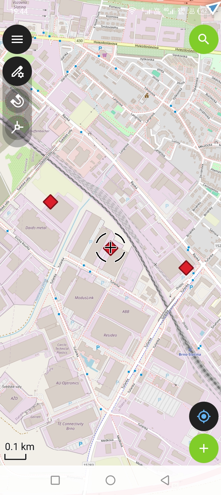 Po otevření projektu se zobrazí mapové okno do kterého se načtou data z projektu. Mapové okno se ovládá podobně jako jiné mapové aplikace tedy s využitím prstů.