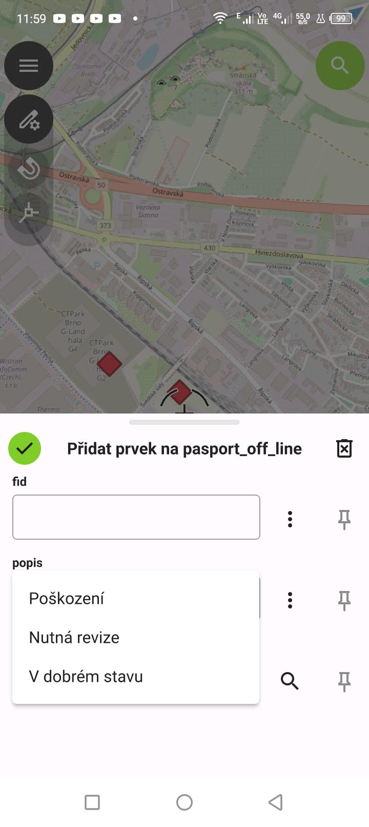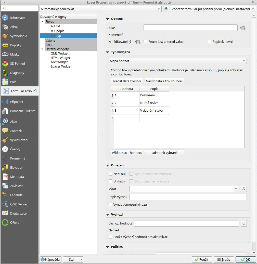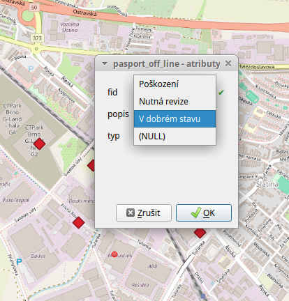 Součástí projektu jsou formuláře, kde je možné pro každou vrstvu nastavit, jak bude vypadat formulář pro editaci atributů. Např. můžete definovat, že se do některého pole mohou zapisovat pouze konkrétní hodnoty z výčtu.